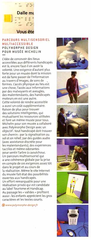 Michelin pour son musée a collaboré avec Polymorphe Design avec un objectif : tout handicapé doit trouver son chemin : par la signalisation au sol en relief, par des guides audio (avec assistance discrète pour les malentendants), des expériences tactiles et même odorantes pour sentir l'arbre à caoutchouc.