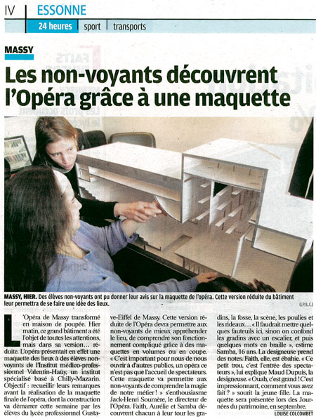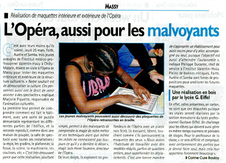L’opéra de Massy transformé en maison de poupée. Hier matin, ce grand bâtiment a été l’objet de toutes les attentions, mais dans sa version…réduite. L’opéra présentait en effet une maquette des lieux à des élèves non-voyants de l’Institut médico-professionnel Valentin-Haüy, un institut spécialisé basé à Chilly-Mazarin. Objectif : recueillir leurs remarques avant la réalisation de la maquette finale de l’opéra, dont la construction va démarrer cette semaine par les élèves du lycée professionnel Gustave Eiffel de Massy. Cette version réduite de l’Opéra devra permettre aux non-voyants de mieux appréhender le lieu, de comprendre son fonctionnement compliqué grâce à des maquettes en volumes ou en coupe.