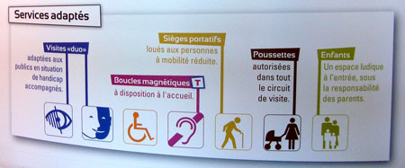 Polymorphe Design a accompagné la "coop'" pour rendre l'ensemble du circuit de visite accessible à tous. Dès son ouverture au public, le 9 mai, le circuit de visite propose des services adaptés. Par exemple, des sièges portatifs, et des bancs... tactiles ! Mais aussi, les supports audio sont tous dotés de boucles magnétiques et sous-titrés en français, et tous les contenus sont traduits en 3 langues sur les téléphones mobiles des visiteurs, grâce à la mise en place de QRCode.